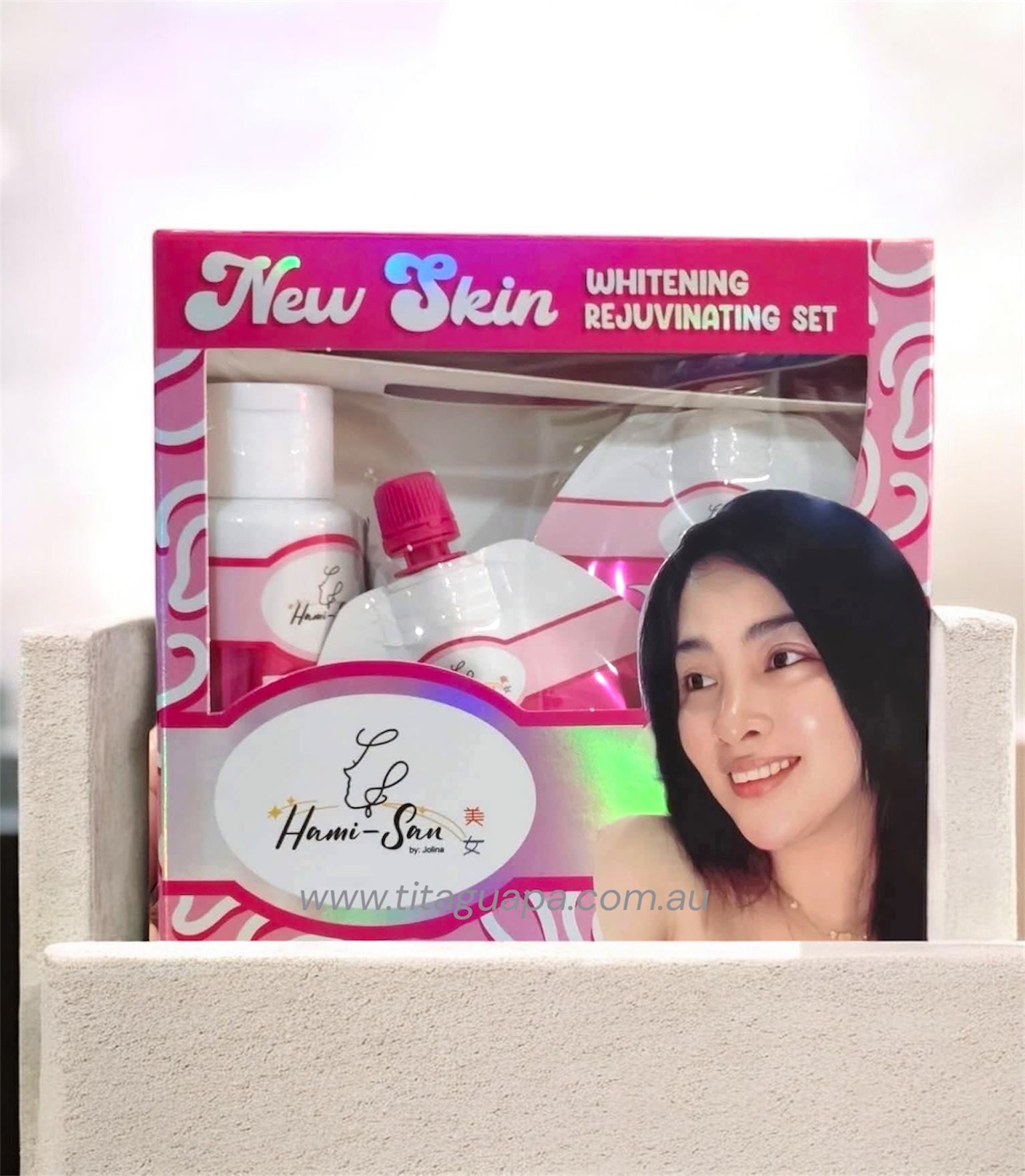 The Hamisan Whitening Rejuvenating Set includes a 60ml rejuvenating toner, 100g kojic acid soap, 10g rejuvenating night cream, and 10g Elite BB day cream. This comprehensive regimen is designed to improve skin clarity, lighten scars and pimple marks, and promote an even complexion, resulting in a more luminous appearance.