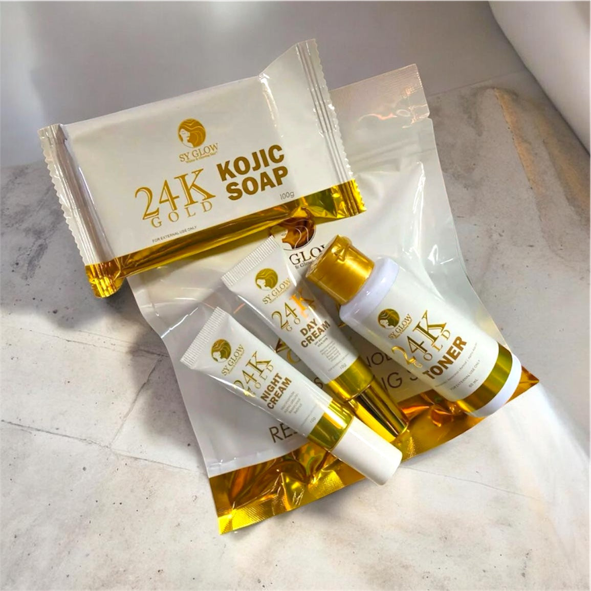 Transform your skin with the SY Glow 24K Gold Resorcinol Rejuvenating Set! This powerful set helps lighten dark spots and uneven skin tone while promoting skin renewal for a smoother texture. Experience a brighter, fresher, and more radiant complexion that enhances your natural beauty!✨